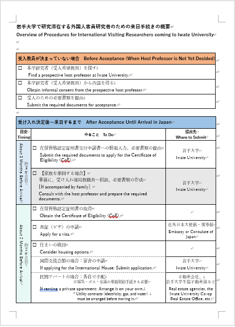 3か月を超えて日本に滞在する国際客員研究員のための、来日直後の手続きや、日本での生活のヒント、日本や岩手を離れる時の手続きについて、概要を紹介しています。参考にしてください。